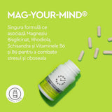 Mag Your Mind® este un supliment alimentar conceput pentru a susține starea de calm, a reduce oboseala și a promova echilibrul sistemului nervos. Principalul ingredient, magneziul bisglicinat, se distinge printr-o absorbție superioară și o acțiune blândă la nivelul tractului gastrointestinal. În plus, formula este îmbogățită cu Rhodiola și Schisandra, doi adaptogeni importanți, și cu vitaminele B6 și B9, care au un rol esențial în menținerea sănătății sistemului nervos și în modularea reacțiilor la stres.
