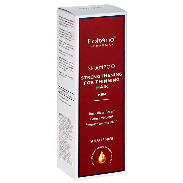 Samponul intaritor Foltene pentru barbati este conceput pentru a combate caderea parului, oferind energie, vitalitate si forta firelor fragile si subtiri. Tricosaccaridele, ingredientul activ din Foltène®, intaresc parul si contribuie la restabilirea echilibrului natural al scalpului. Extractul de capsicum (ardei rosu) stimuleaza volumul parului si sprijina sanatatea scalpului. Formula delicata, fara sulfati, siliconi, uleiuri minerale sau ceara de parafina, utilizeaza surfactanti usori obtinuti din cocos si ulei de palmier, lasand parul moale, stralucitor si usor de manevrat. Rezultatele includ par mai puternic, mai voluminos, revitalizat si cu stralucire naturala.